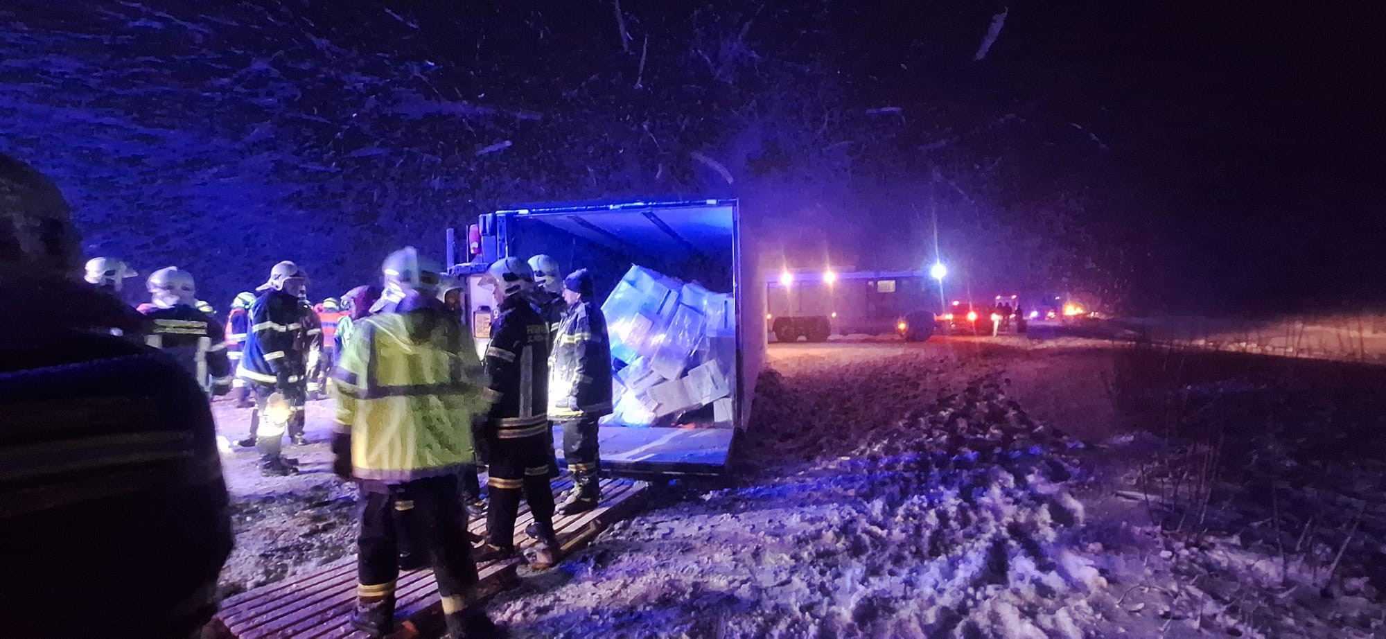 Während die Bergearbeiten des ersten LKW noch im Gange waren, ging kurz nach Mitternacht ein weiterer Notruf ein: Ein LKW war nach einem Unfall auf der Seite zum Liegen gekommen und ein Kleinbus und ein PKW waren auf ihn aufgefahren, von rund zehn Verletzten Personen war die Rede. Mit dem Meldebild „T3 Verkehrsunfall – Menschenrettung – mehrere Personen“ wurde die Stadtfeuerwehr erneut in Marsch gesetzt. Eingeklemmt war auch hier glücklicherweise niemand, die Betreuung der Verletzten übernahm der Rettungsdienst.