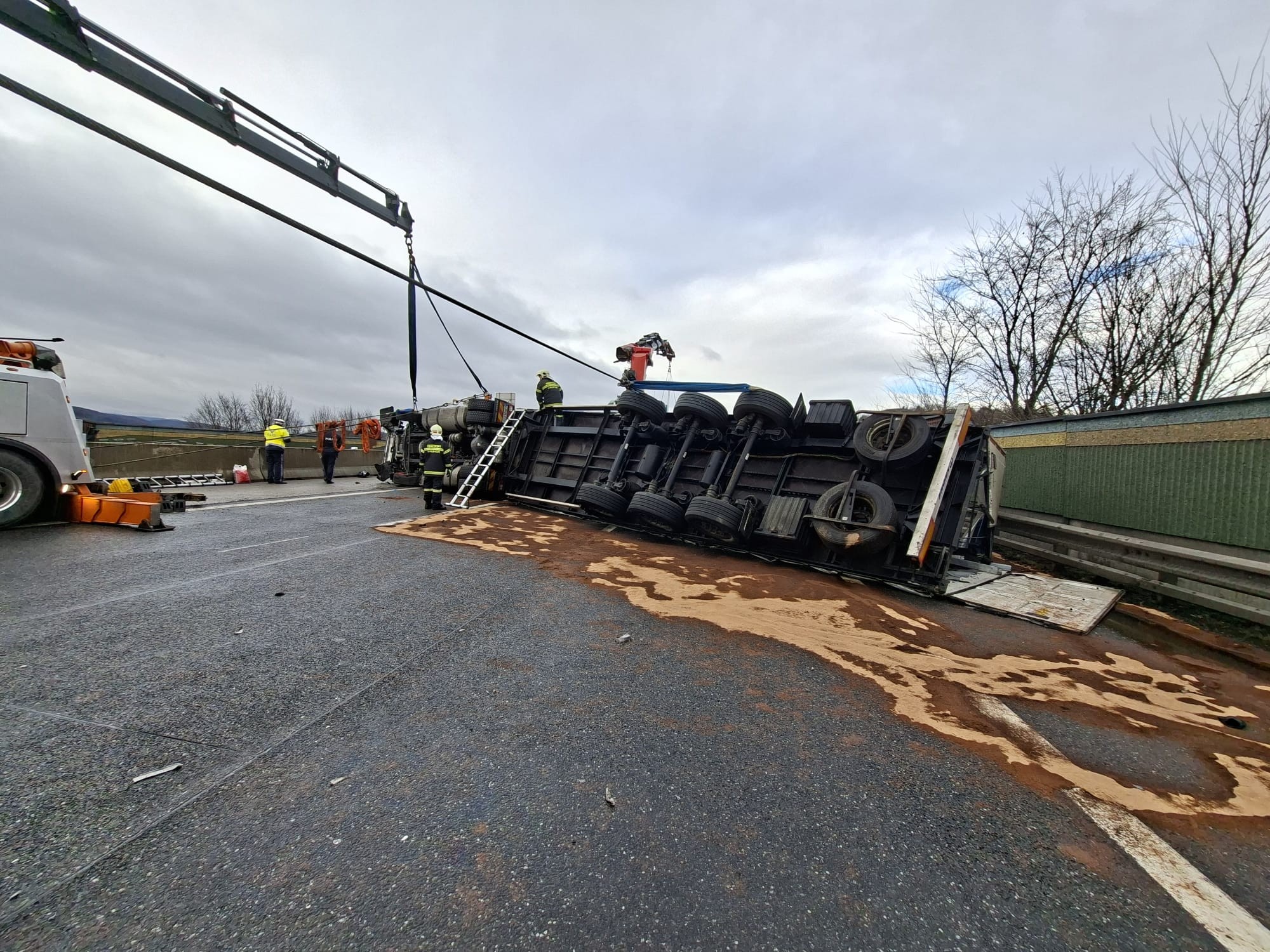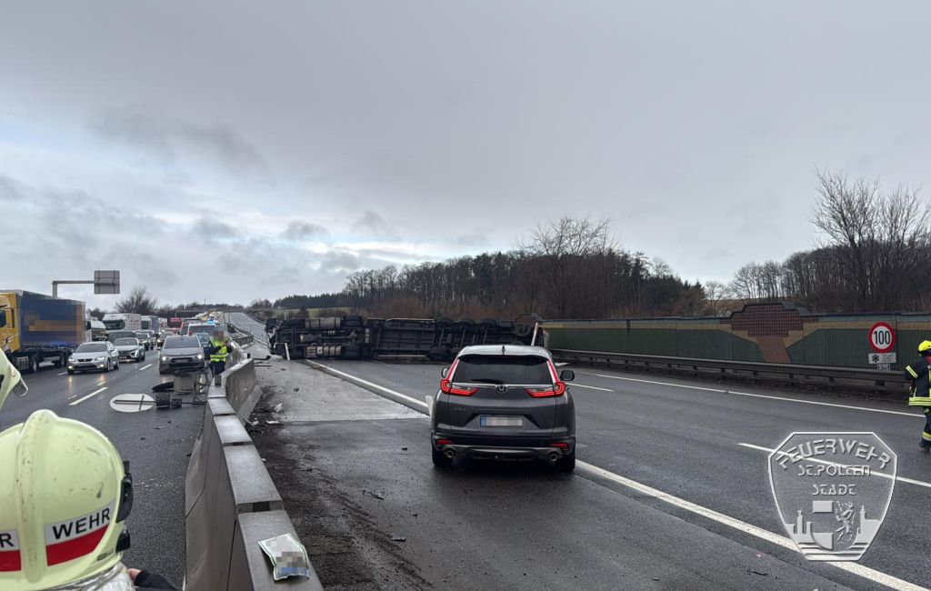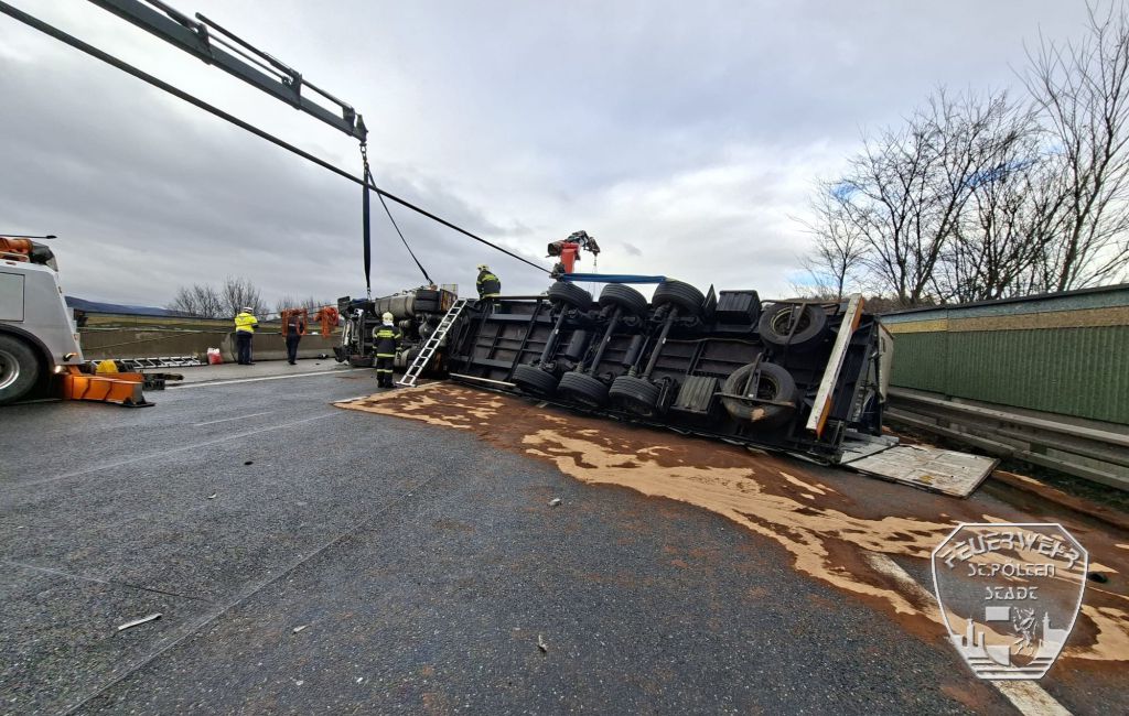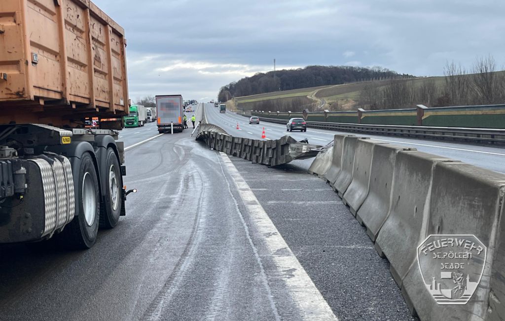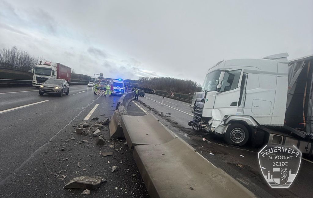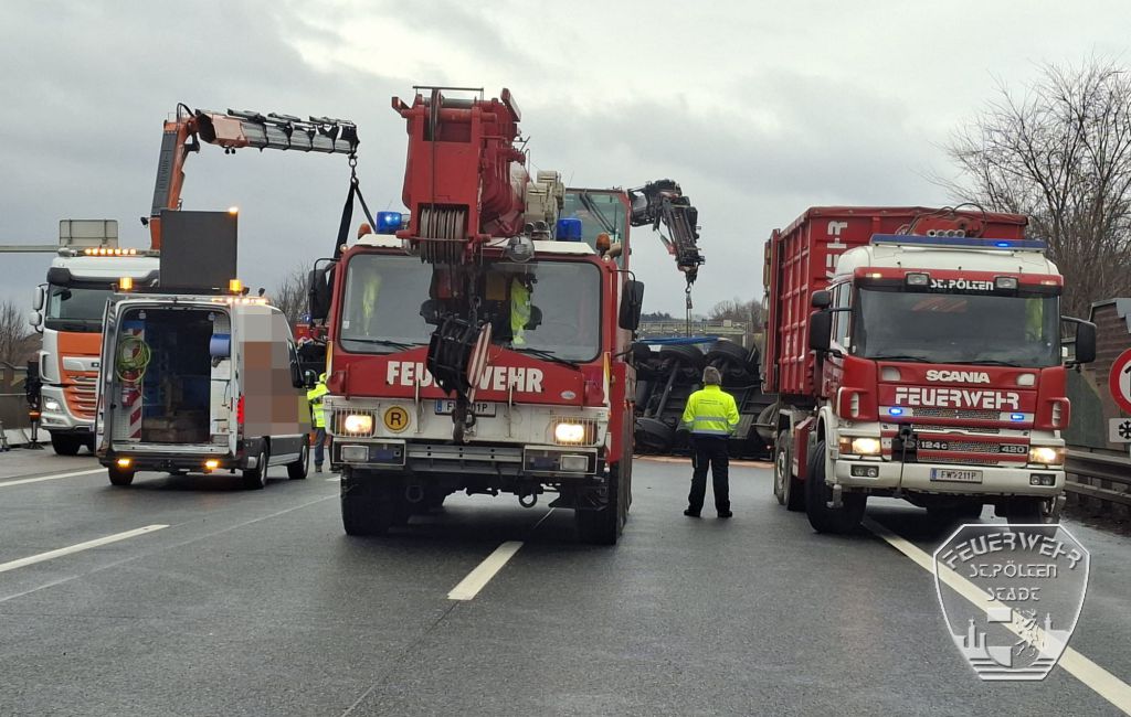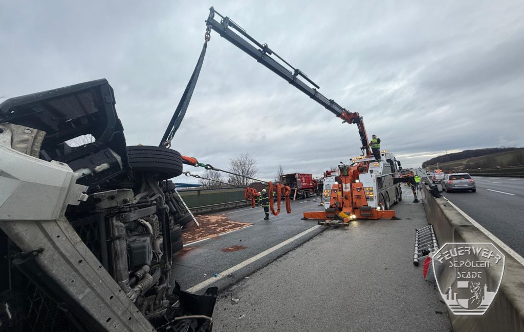 Laut Alarmierung sollte sich auch noch ein LKW-Lenker in dem Unfallfahrzeug befinden. An der Unfallstelle auf der Westautobahn A1 angelangt konnte die Mannschaft des binnen weniger Minuten ausgerückten Vorausfahrzeugs feststellen, dass die Lenker beider beteiligter LKW bereits aus den Fahrzeugen befreit waren. Ein LKW lag jedoch über alle drei Fahrspuren auf der Seite und verlor Treibstoff auf seinem bei dem Unfall beschädigten Tank, ein weiterer hatte die Beton-Mittelleitwand teilweise auf die andere Richtungsfahrbahn verschoben, in beiden Fahrtrichtungen bildete sich in kürzester Zeit Stau.