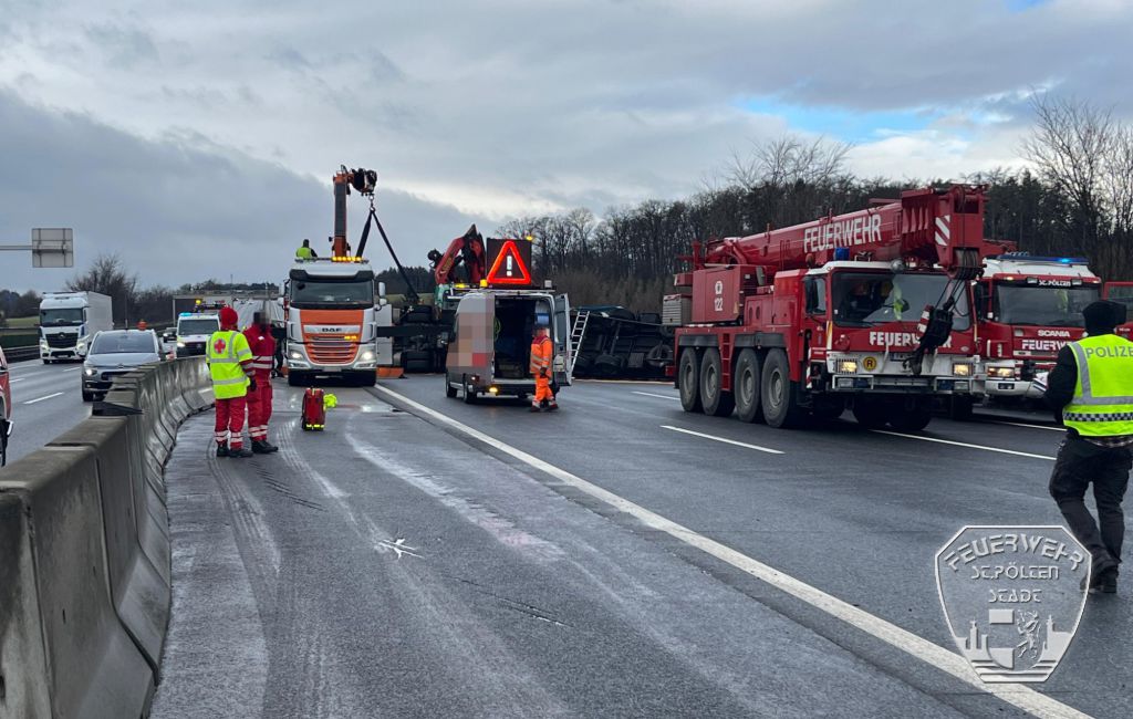 Laut Alarmierung sollte sich auch noch ein LKW-Lenker in dem Unfallfahrzeug befinden. An der Unfallstelle auf der Westautobahn A1 angelangt konnte die Mannschaft des binnen weniger Minuten ausgerückten Vorausfahrzeugs feststellen, dass die Lenker beider beteiligter LKW bereits aus den Fahrzeugen befreit waren. Ein LKW lag jedoch über alle drei Fahrspuren auf der Seite und verlor Treibstoff auf seinem bei dem Unfall beschädigten Tank, ein weiterer hatte die Beton-Mittelleitwand teilweise auf die andere Richtungsfahrbahn verschoben, in beiden Fahrtrichtungen bildete sich in kürzester Zeit Stau.